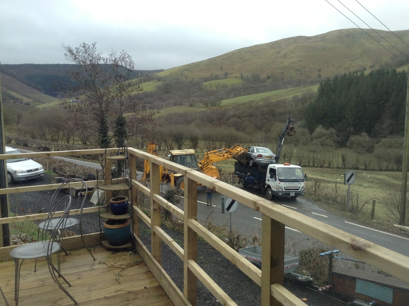 We live on a very busy trunk road, it's one of the major routes across Wales from the Midlands, but the traffic control consisted of a couple of men stood in the road waving at the cars. The crashed car itself had to be hauled out by a JCB, it was then dragged up the main road, dangling body work falling off as it went, before being manoeuvred on to the back of the scrap vehicle lorry, barely bigger than the car itself, and already half full of scrap...
