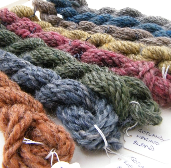 These samples are all blended with wool, the one at the back is plain Gotland spun semi worsted, and you can see how much longer that sample skein is compared to the others.